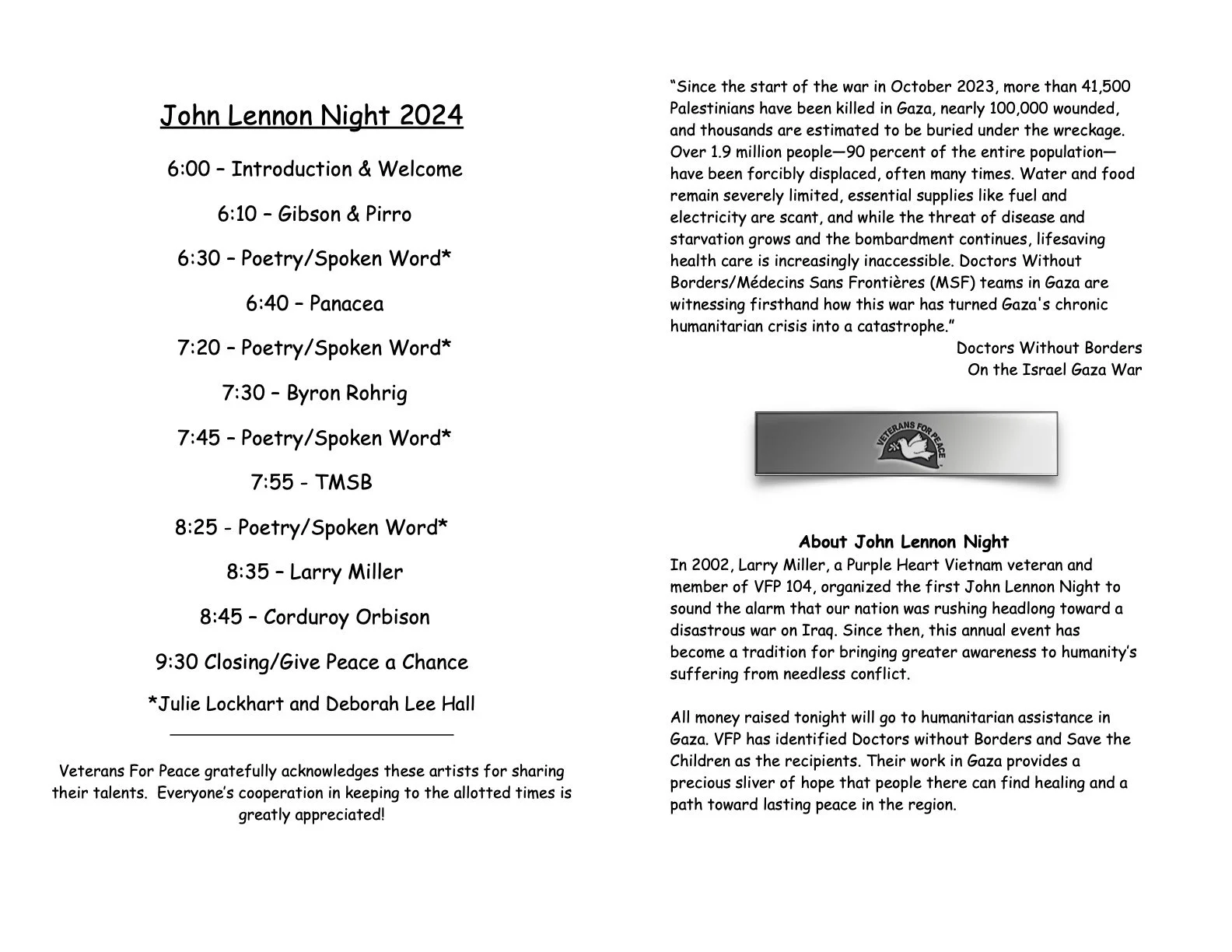 Thanks to all who came out on John Lennon Night and helped us raise awareness and financial support for humanitarian assistance in Gaza. We packed the Bokeh Lounge and enjoyed nice tributes to the legacy of John Lennon. With VFP104’s financial commitment and your help we are sending Doctors Without Borders and Save the Children each $3500. Here’s the tally: